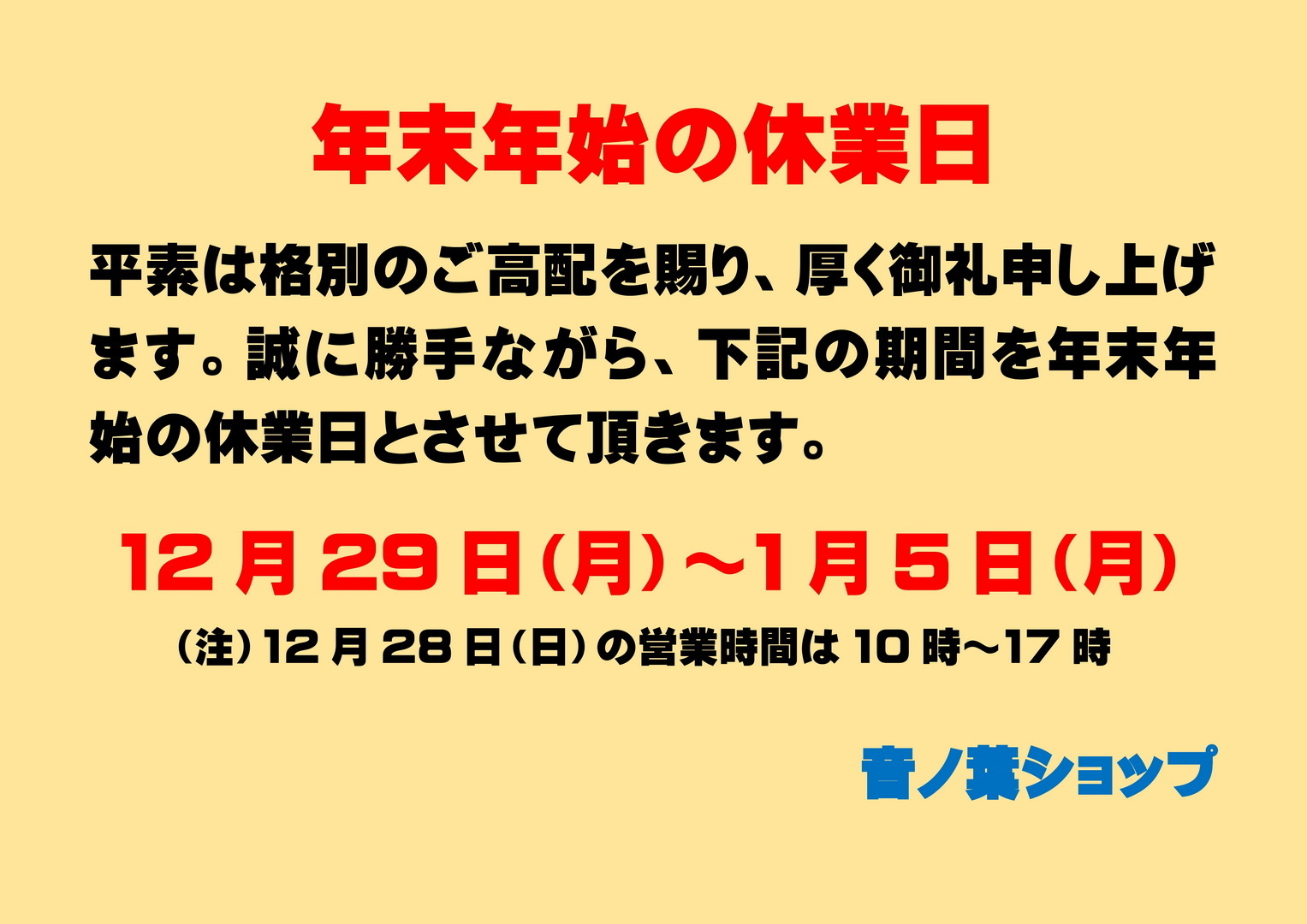 一覧へ戻る 【音ノ葉】年末年始の休業日[グリーンショップ]注目重要NEW 誠に勝手ながら、下記の期間を年末年始の休業日とさせていただきます。ご了承の程何卒よろしくお願い申し上げます。12/28(日):営業時間短縮(10:00~17:00)12/29(月)~1/5(月):年末年始の休業日営業カレンダー